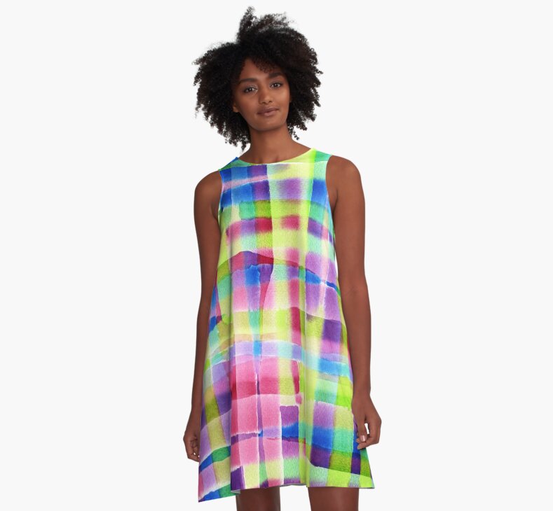 Hand-Painted Gingham Weave Watercolor Rainbow A-Line Dress